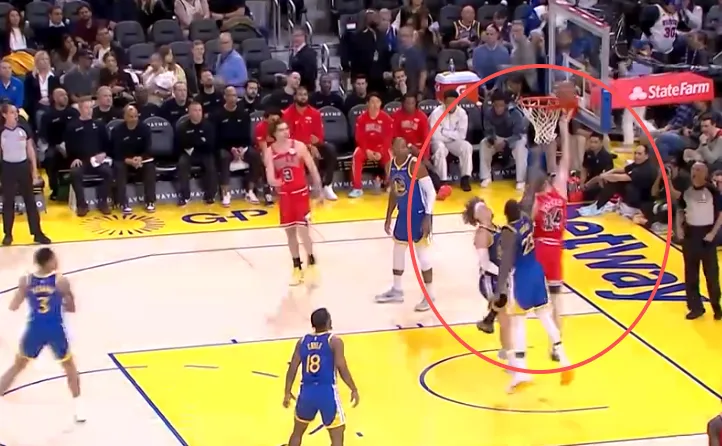 迪林汉姆左翼持球与亚布塞莱发动挡拆配合,被勇士换防破解后立即出球给弱侧接应的布泽利斯,